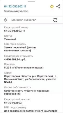 Кад. номер64:48:020202:17Кад. квартал64:48:020202ТипЗемельный участокСтатус - Ранее учтенныйМежевание - ПроведеноАдресг СаратовПочтовый индекс410000Кад. стоимость - 2,451,000.00 руб.Площадь - 57000 м2Наличие залога в банке - НетАрест и ограничения - НетПо документам - Личное подсобное хозяйствоКатегория земель - Земли населенных пунктовПостановлен на учёт - 21.09.2011Возможно перевести назначение земли.Екатерина Д.