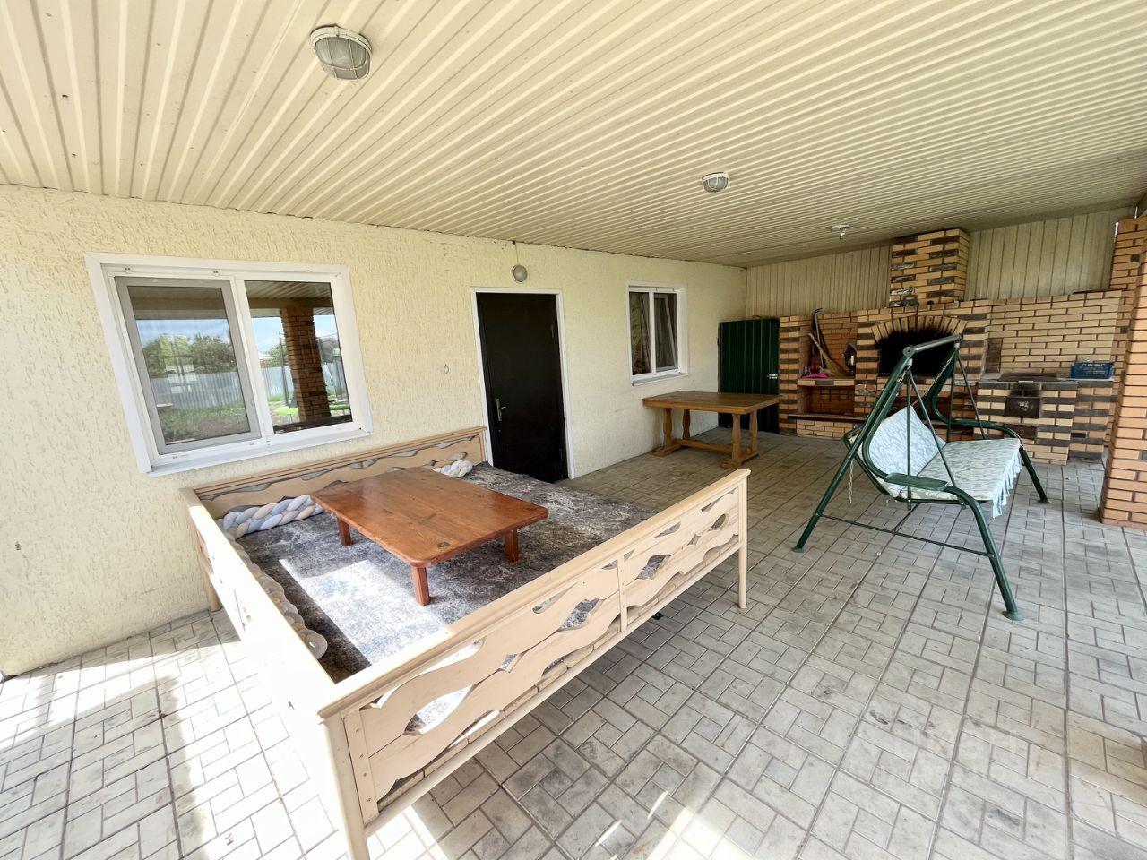 На земельном участке площадью 9 соток расположены: летняя кухня и баня с газовым котлом, отапливаемые круглогодично, зона барбекю с кирпичной кладкой, гараж на 2 автомобиля, хоз.постройки, летний душ и туалет. Забор - профнастил. Двор вымощен плиткой.