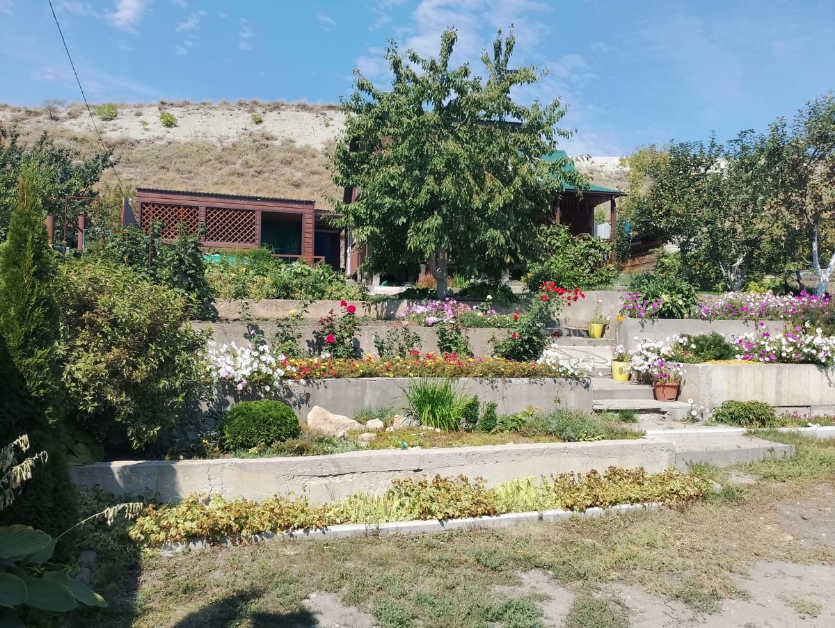 На участке плодовые деревья, черешня, слива, яблони, груша, персик. Малина, малина, клубника.