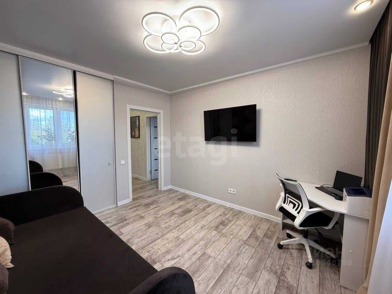 Планировка продумана для комфортного проживания: изолированные спальни, гостиная, просторная кухня с современной техникой. Санузел раздельный, в прихожей предусмотрена система хранения - шкаф-купе с зеркальными дверьми. Отделка выполнена с использованием качественных материалов: керамогранит в зонах повышенной проходимости, ламинат 33 класса в жилых помещениях, натяжные потолки с точечным освещением и люстрами.