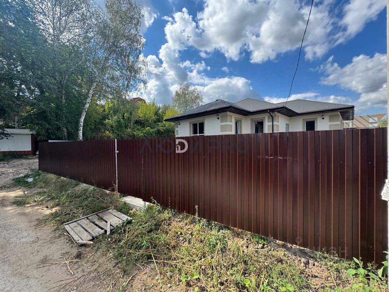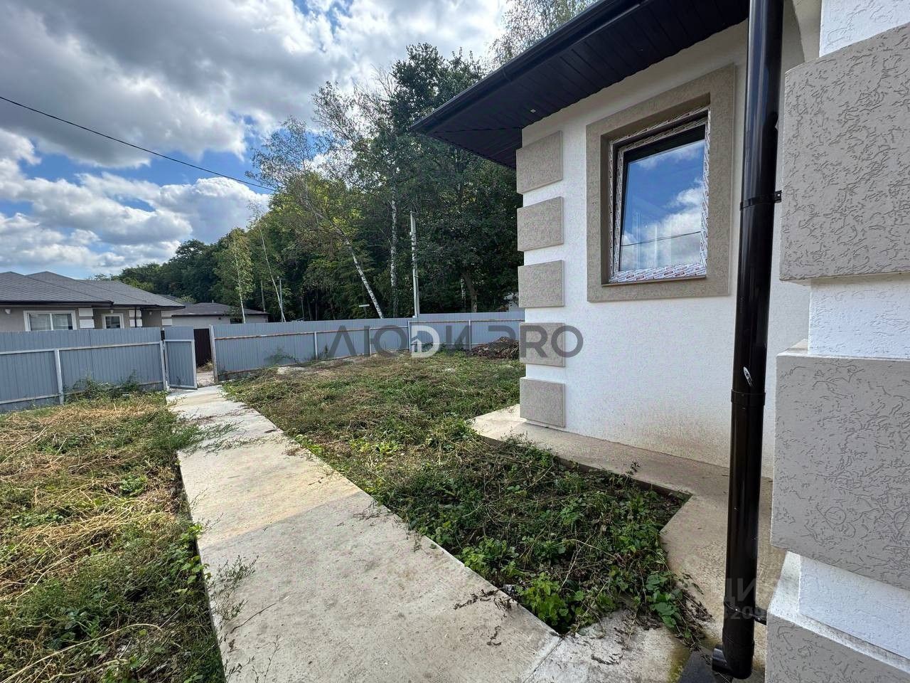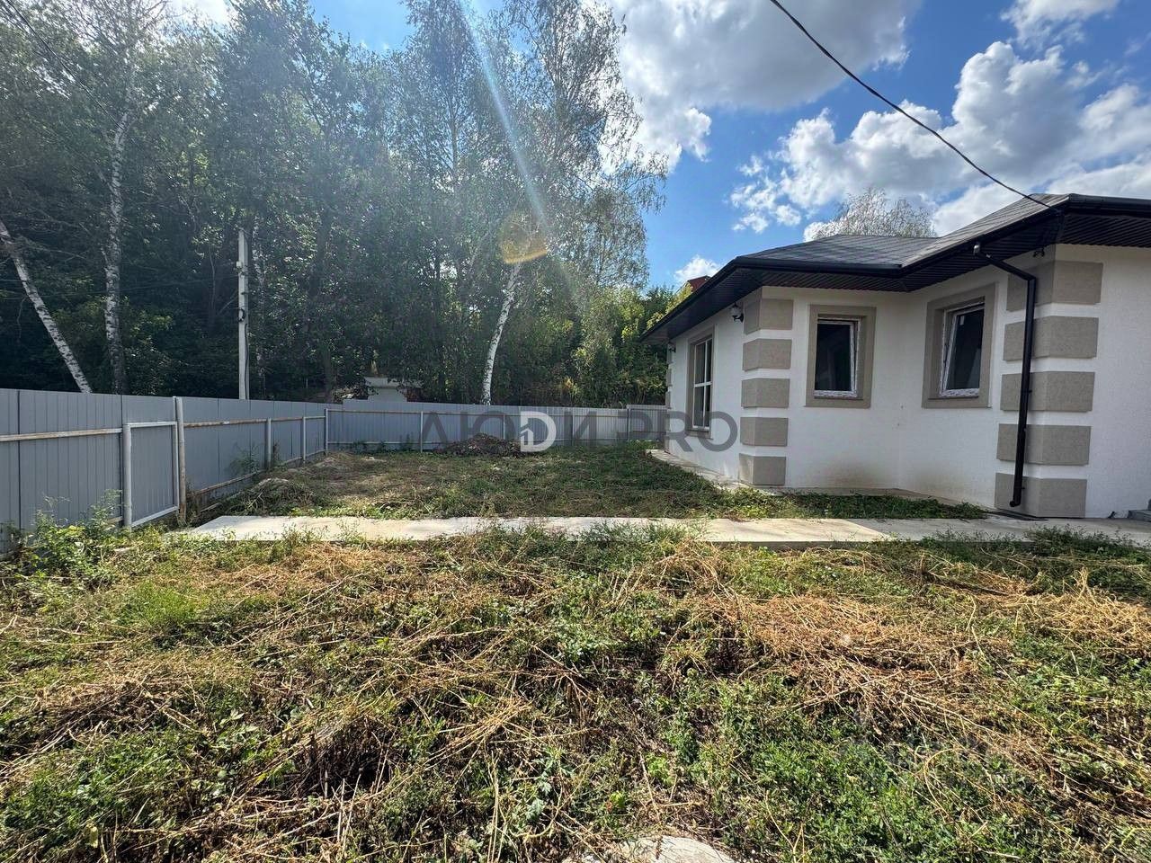 Во дворе: залита бетонная дорожка к дому и по периметру, участок огорожен забором.