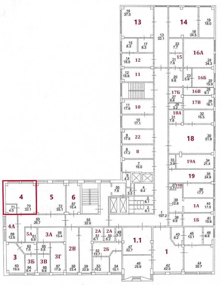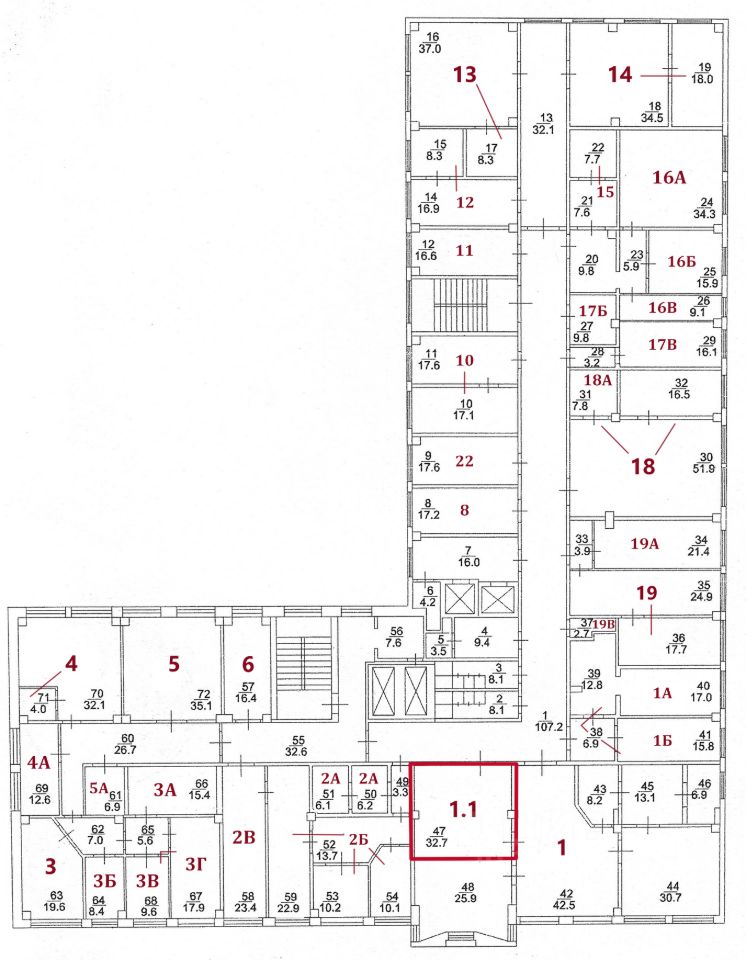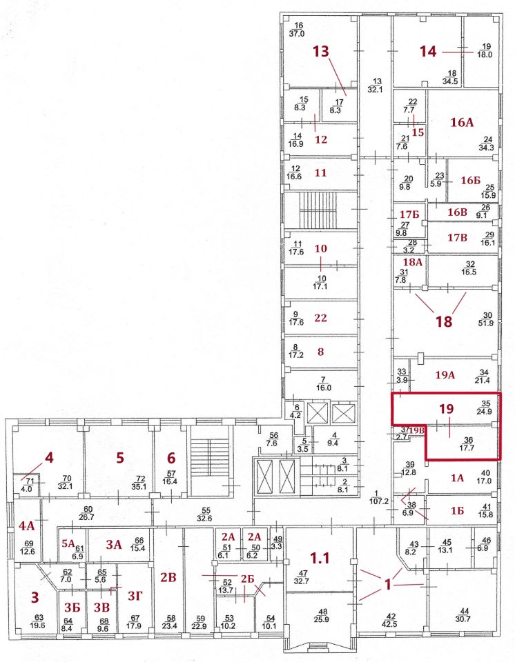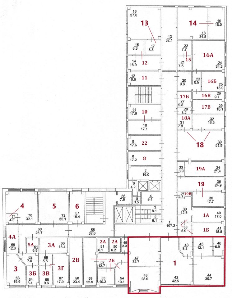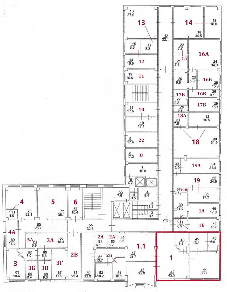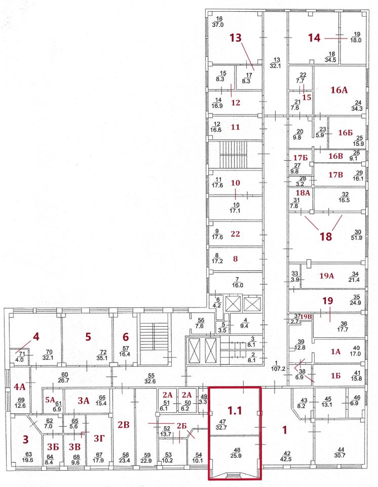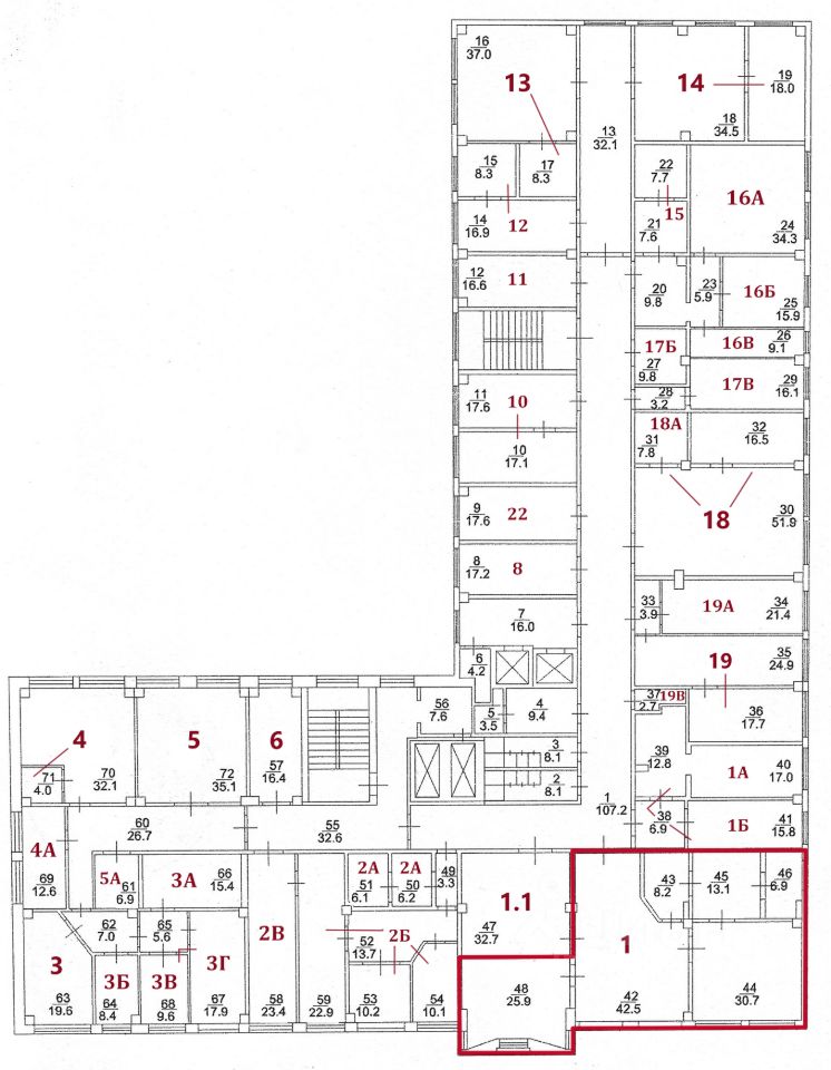На текущий момент свободны помещения, выделенные на плане красным цветом. Стоимость аренды за каждое помещение обозначается по запросу.