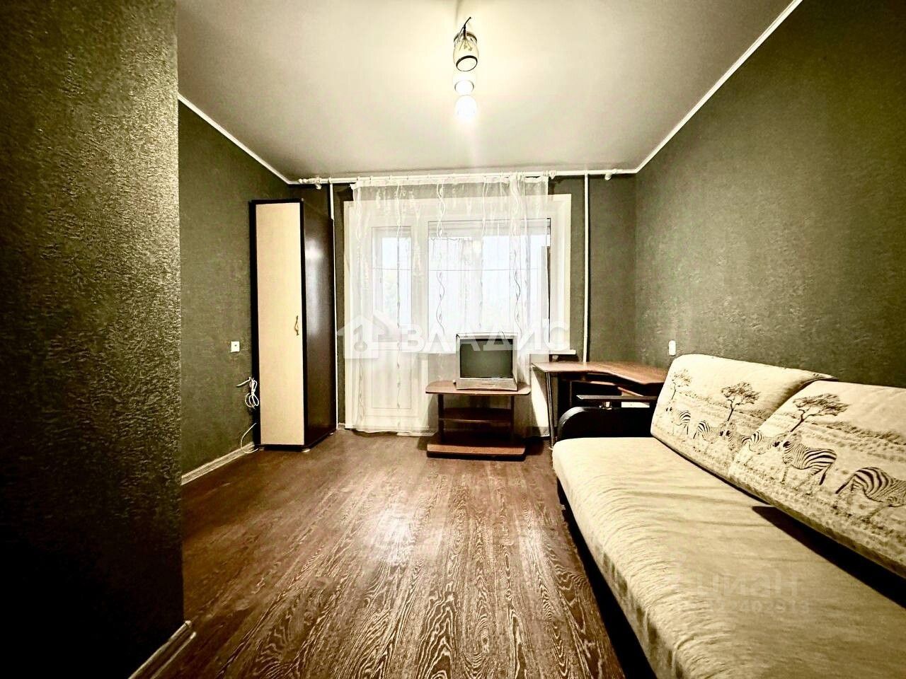 Есть все необходимое для проживания: холодильник, микроволновка, стиральная машинка, телевизор, диван, шкаф..