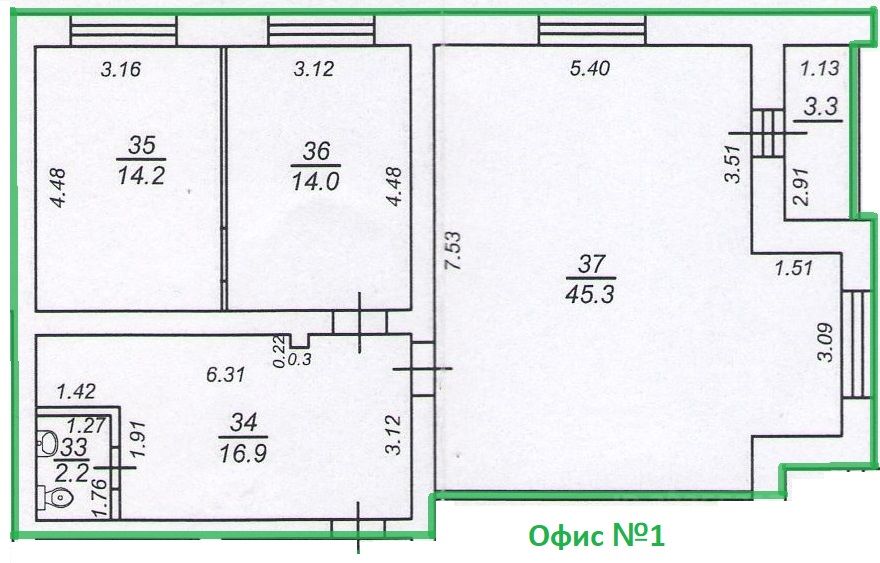 Площадь офиса 92,6 м² + лоджия 3,3 м².