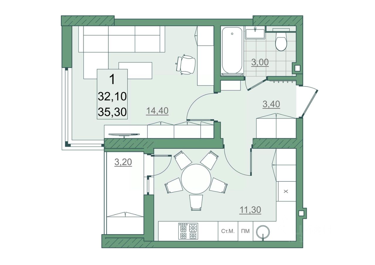 Общая площадь32,1 м2