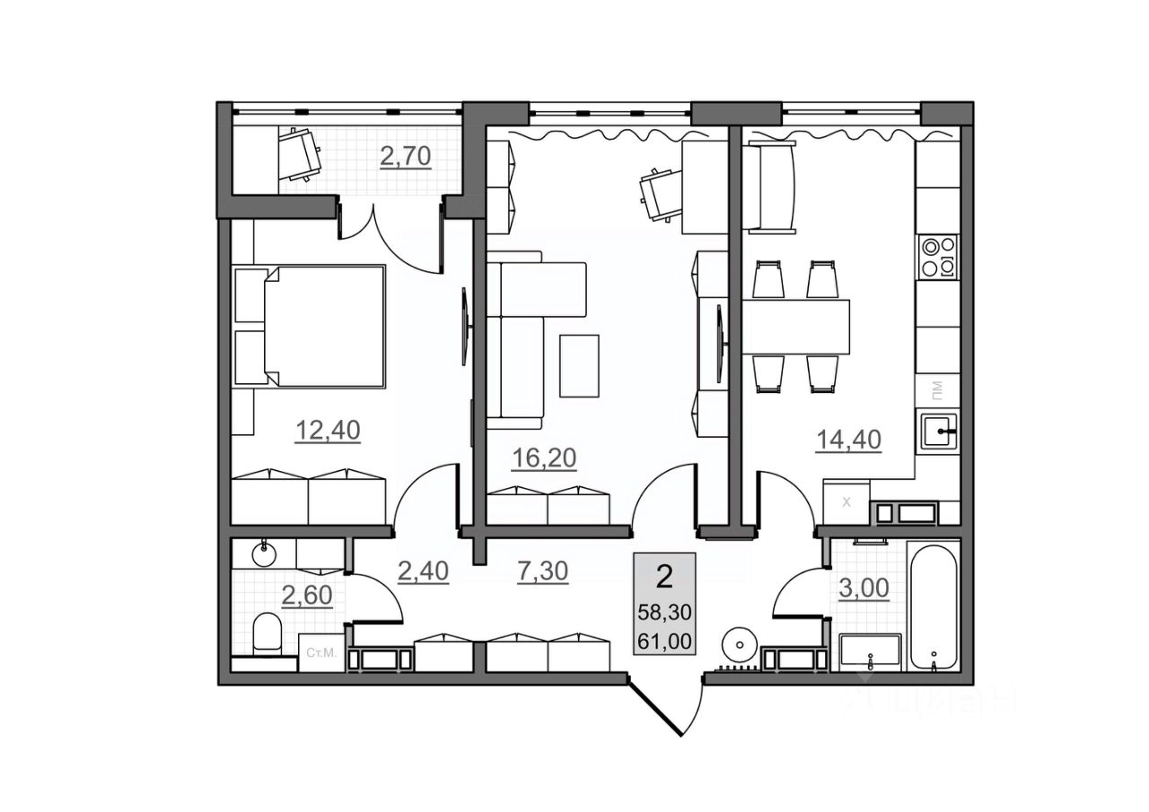 Общая площадь58,3 м2