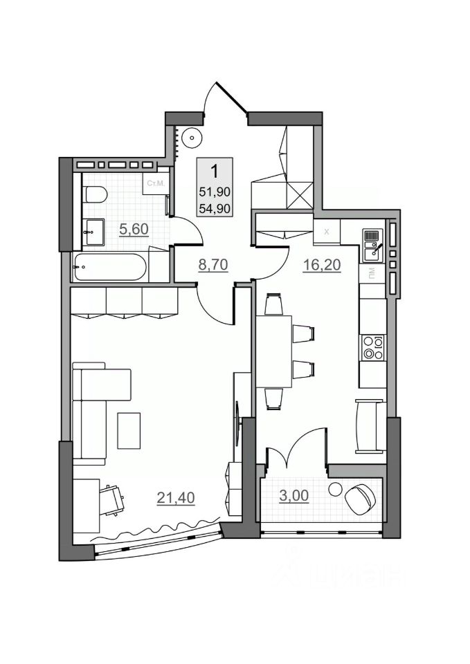 Общая площадь51,9 м2