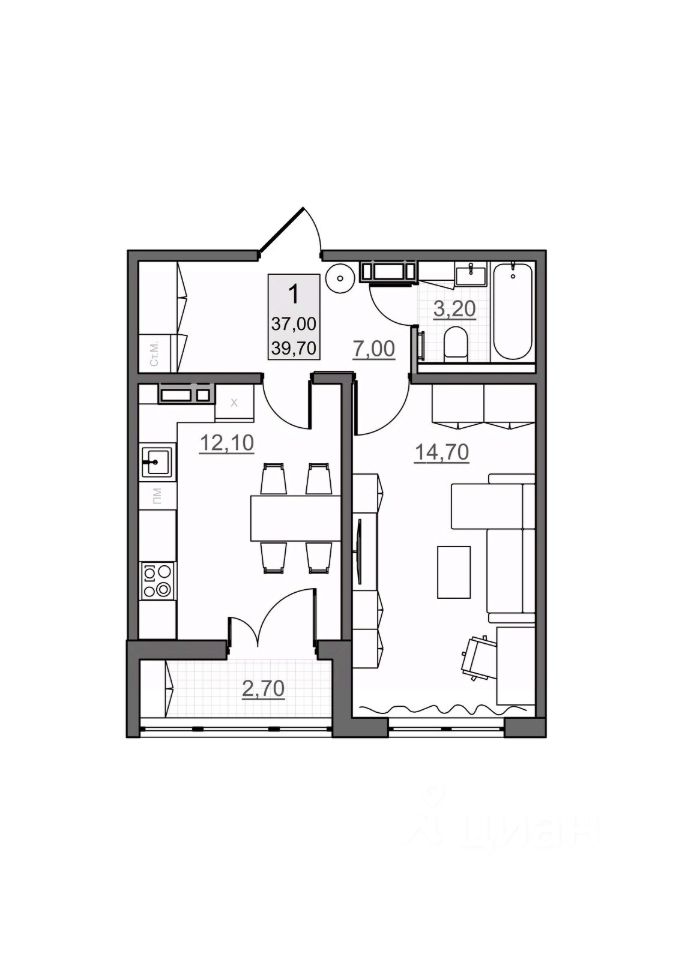 Общая площадь37 м2