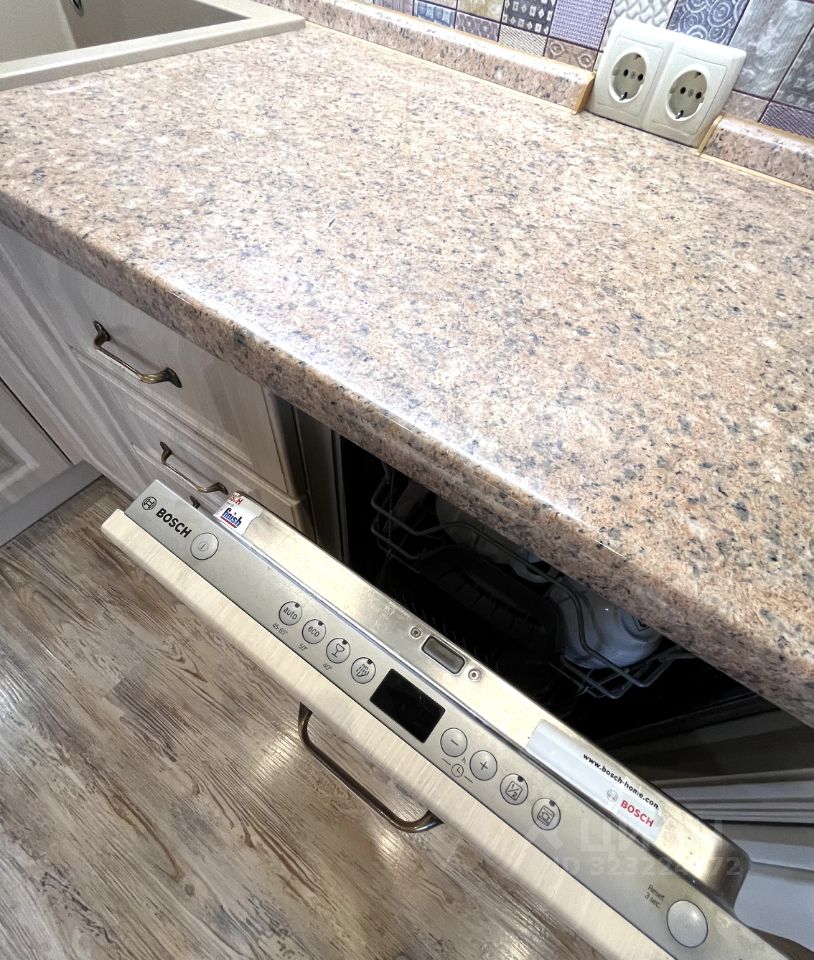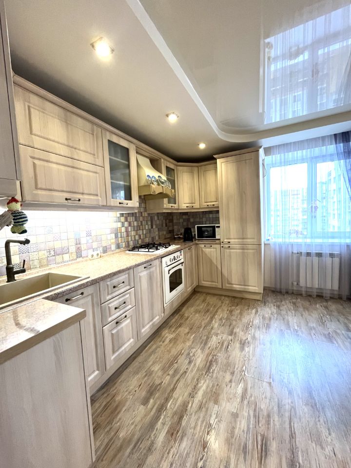 Светлая кухня оснащена современным гарнитуром и встроенной бытовой техникой (посудомоечная машина, духовой шкаф, варочная панель, вытяжка, холодильник). Встроенная мебель и техника остаются.