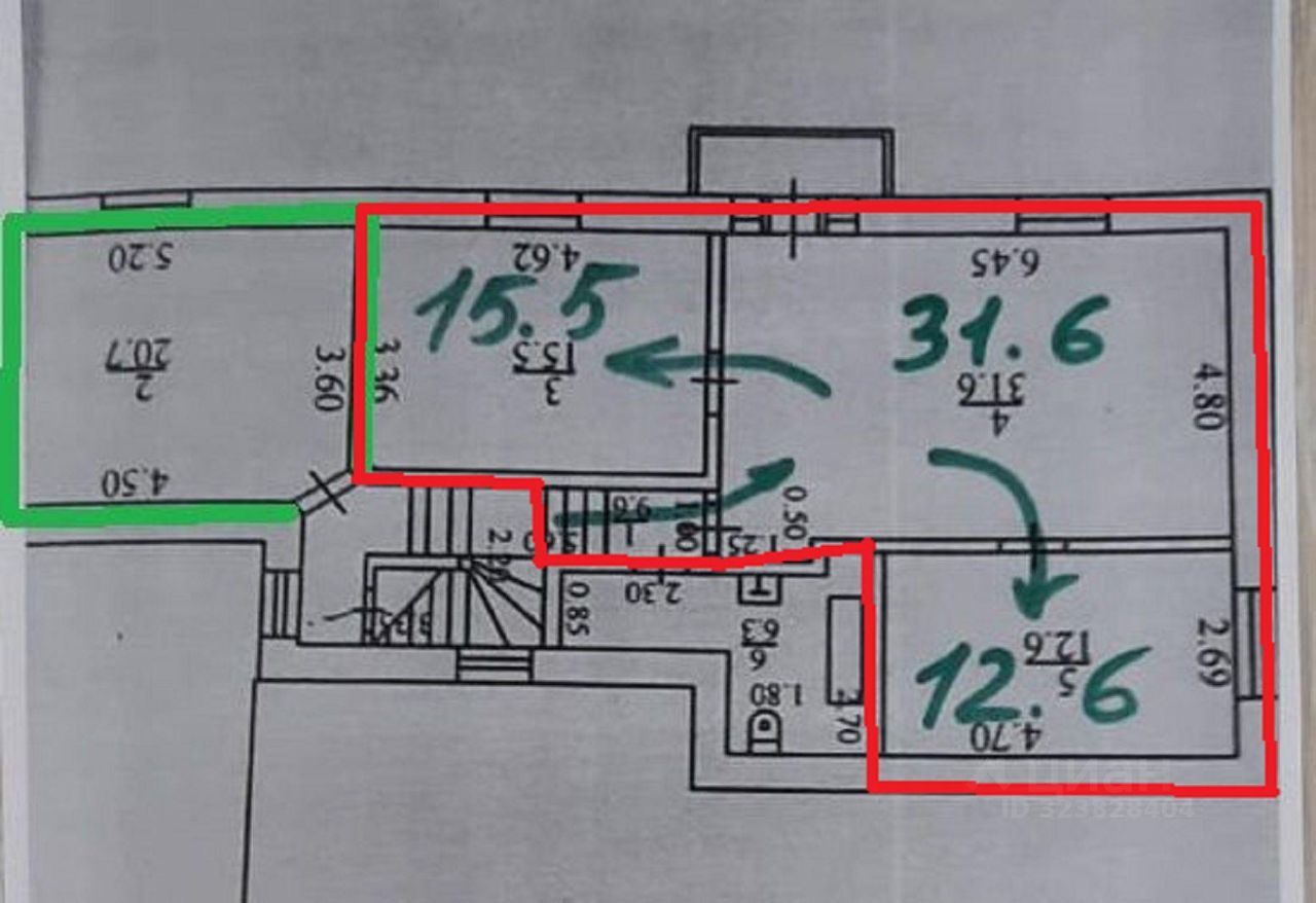 Состоит из трех смежных комнат 15,5 м2, 12,6 м2 и 31,6 м2 с выходом на балкон,