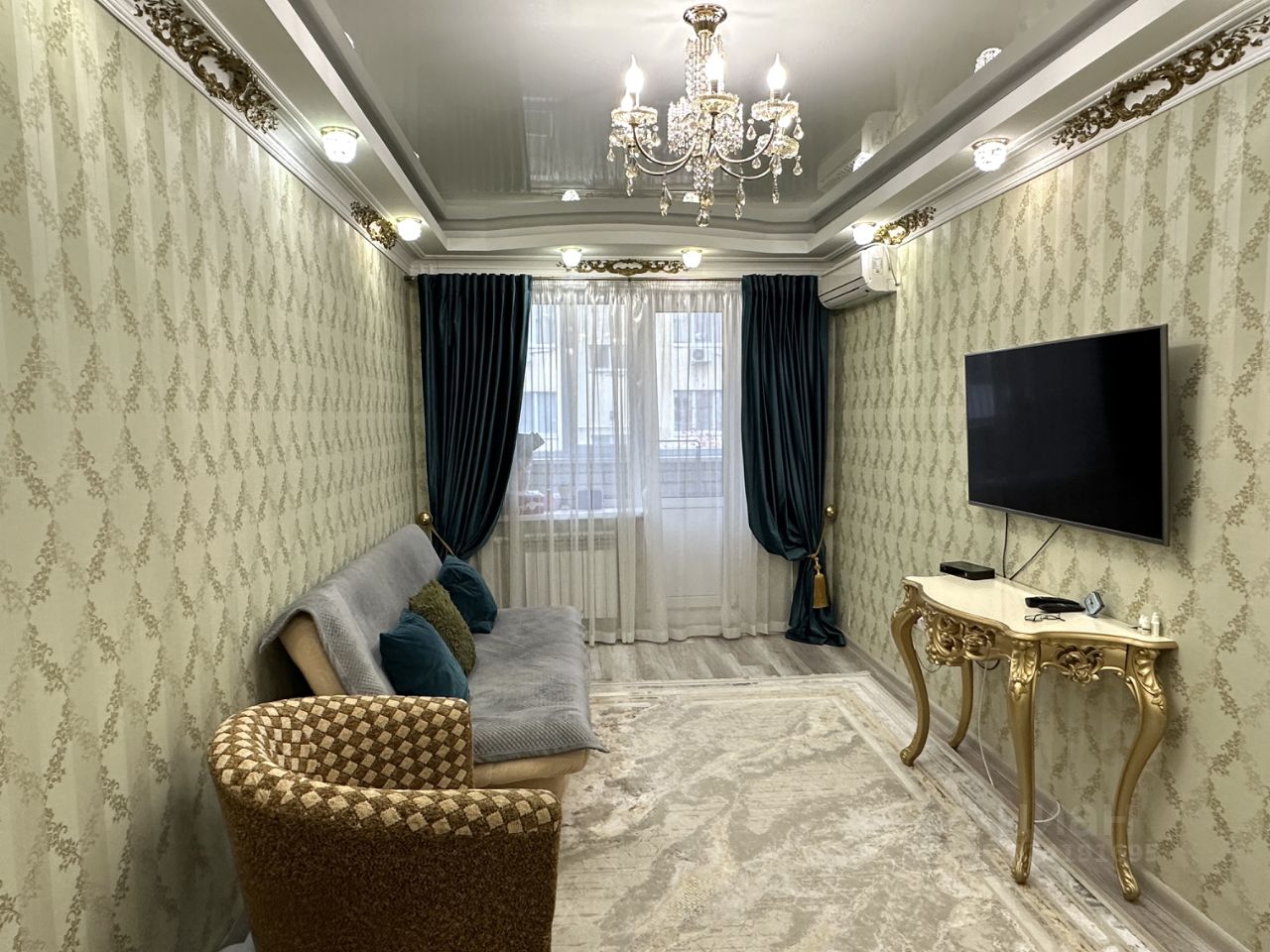 - Гостиная оборудована диваном, раскладным столом из дуба, консолью и кондиционером. - Спальная комната оснащена шкафом-купе и комодом.