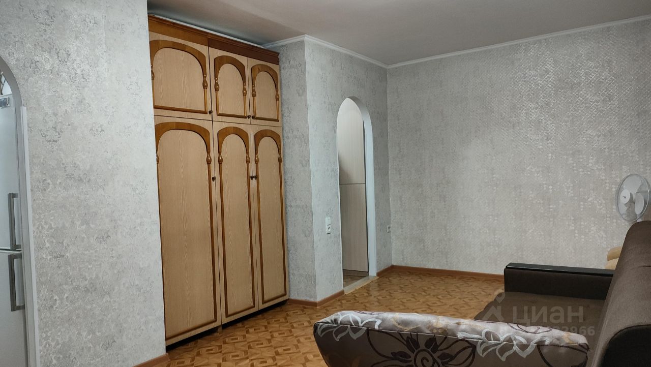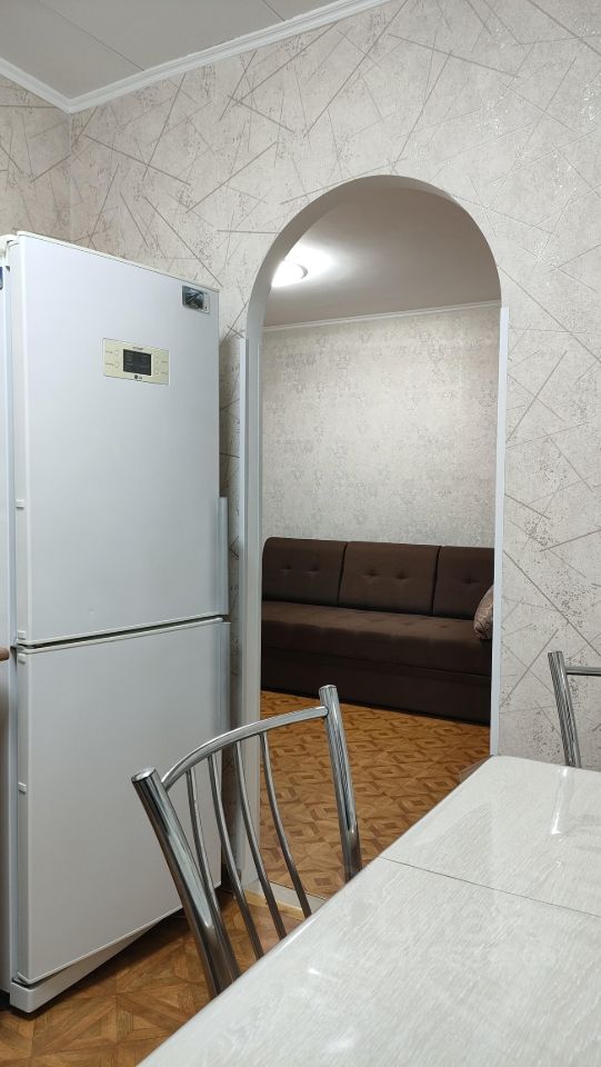 В комнате диван, шкаф, есть телевизор. Из мебели на кухне-кухонный гарнитур, холодильник, микроволновка, газ/плита, вытяжка, вся посуда. Санузел совмещённый- ванна, стиральная машинка.
