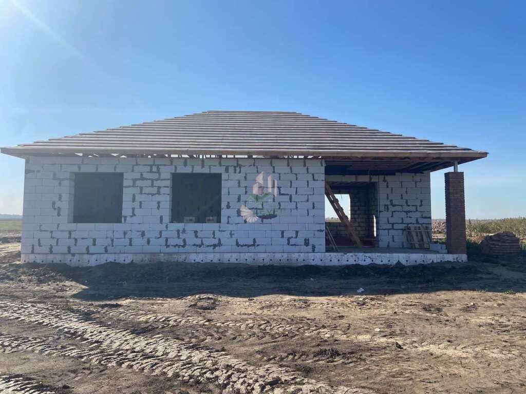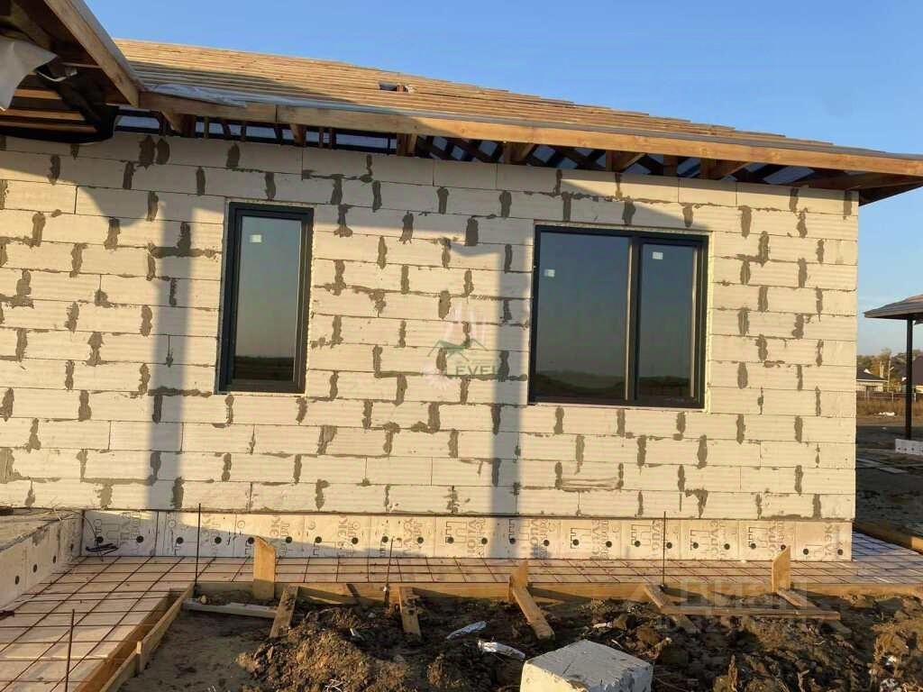 Дом выстроен на ленточном фундаменте+отмостка с зубом. Стены из газоблока с фасадным утеплением, кровля построена из массива и обшита мягкой кровлей (не шумная).