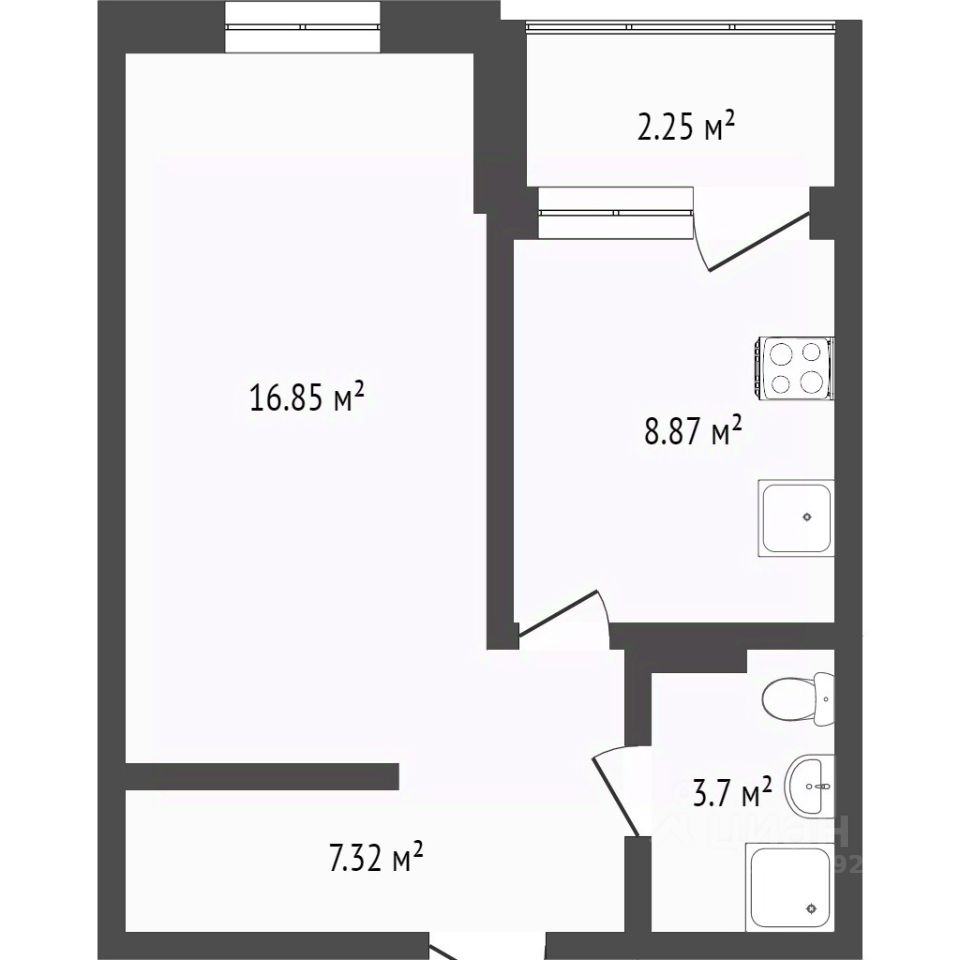 Общей площадью 35.2 м2, с большой кухней 9.3 м2.