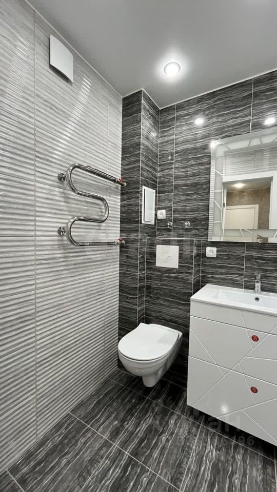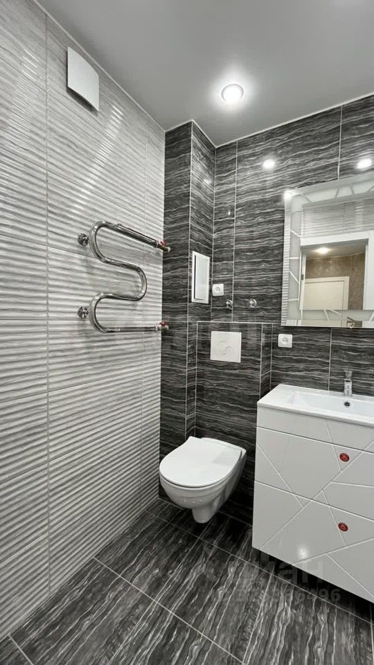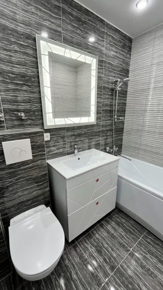 Большая стильная ванная комната, в которой расположена вместительная тумба с двумя ящиками и зеркалом с подсветкой.