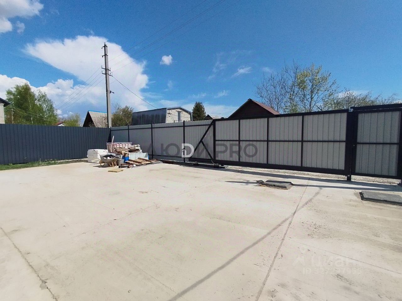 Участок 5 соток с забором из профиля, откатными воротами и бетонной площадкой (парковка/зона отдыха). Рядом лес и речка. Участок ровный, квадратный, есть возможность построить баню и разместить зону отдыха.